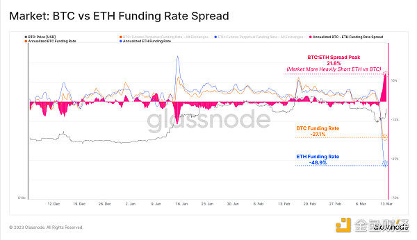 在这次反弹之前,永续掉期市场的融资利率进入了极端的现货溢价水平。交易员分别支付 -27.1% 和 -48.9% 的年化资金利率来做空 BTC 和 ETH。交易员做空 ETH 的力度也大得多,BTC:ETH 的价差达到 21.8%,这是自 FTX 抛售以来的最大水平。