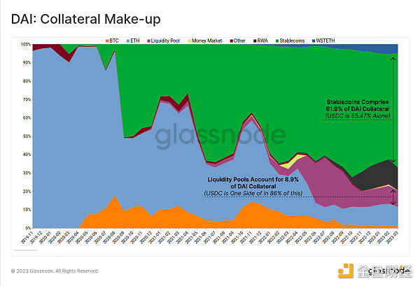 这一事件无疑开启了关于 DAI 的长期影响的讨论,DAI 据称是一种去中心化的稳定币。然而,这一事件证明了 DAI 的价格是如何通过抵押品组合(其中还包括额外的 12.4% 的代币化现实世界资产)与传统银行系统密切相关的。