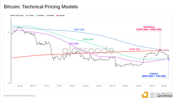比特币价格发现在几种流行且广泛观察的技术分析定价模型之间交易。其在 2 月在 200 周和 365 天移动平均线(~25.0k)处遇到阻力后,价格在本周触及 200 天和 111 天移动平均线(~$19.8k)附近然后反弹。