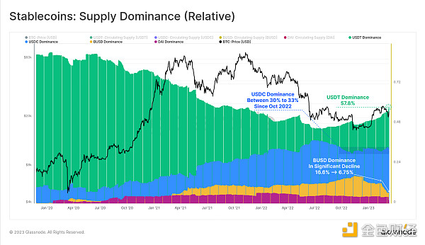 自 2022 年 10 月以来,USDC 一直占据 30% 至 33% 的主导地位,但随着赎回窗口周一重新开启,供应量是否会减少还有待观察。BUSD 在最近几个月出现了急剧下降,发行人 Paxos 停止了新的铸造,并且主导地位从 11 月的 16.6% 下降到今天的 6.8%。