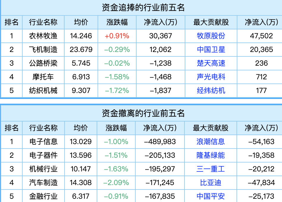 主力资金尾盘净流入电子、农林牧渔、国防军工板块,净流出电力设备、计算机、机械设备等板块。