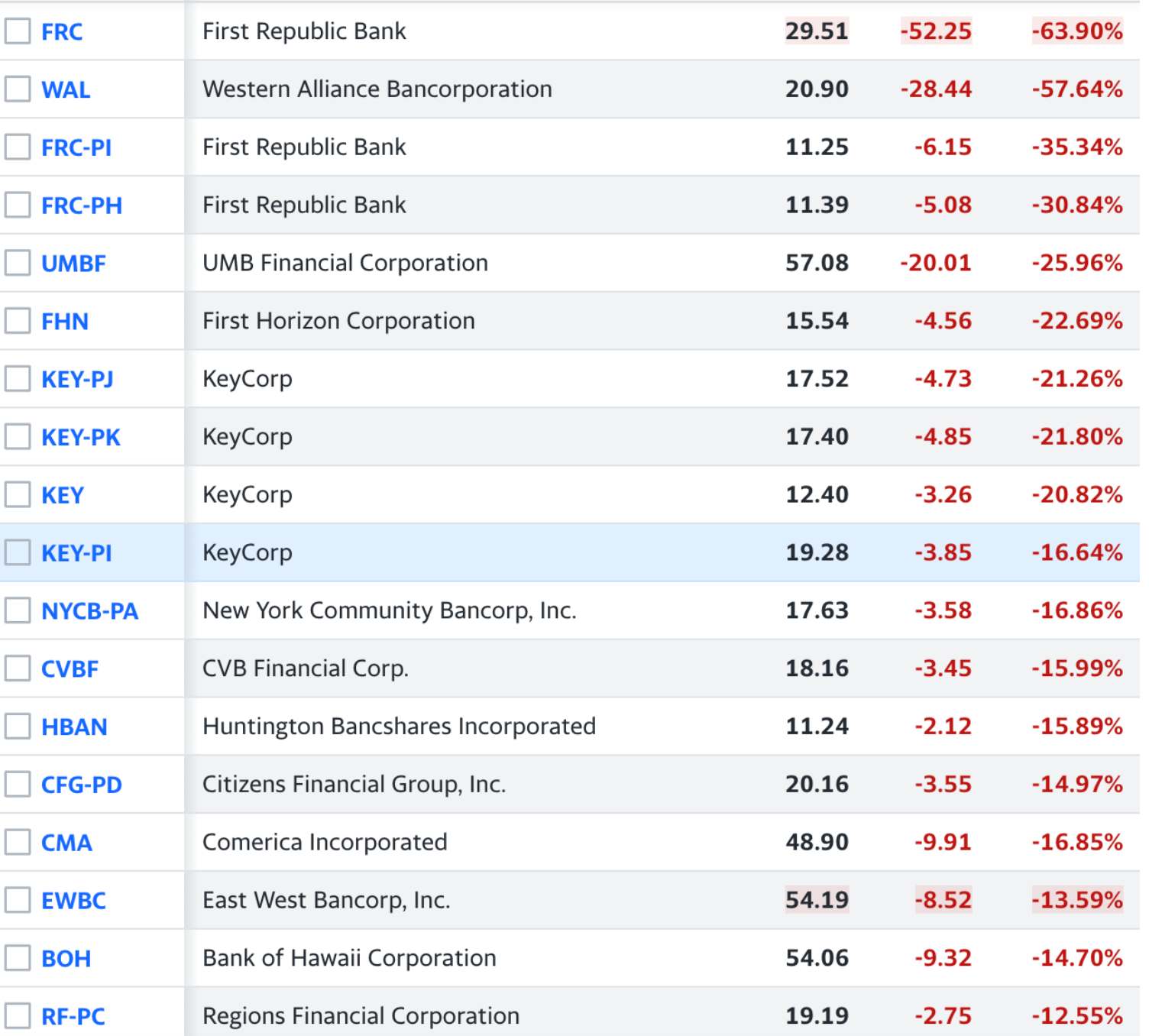 看一下雅虎财经的最大输家名单,就会发现一长串的银行股严重失血。