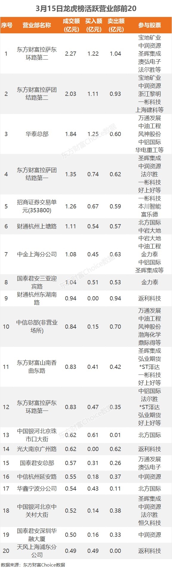 从营业部角度来讲,华泰总部日内成交1.84亿元,参与了万通发展、中油工程、风神股份、中铝国际、华电重工等股票。招商证券交易单元(353800)日内成交1.26亿元,参与了一彬科技、本川智能和富乐德。财通杭州上塘路日内成交1.11亿元,参与了北方国际和中岩大地。