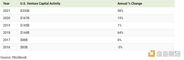2021年,美国风险资本支持的公司筹资额达3300亿美元,创下历史记录,是2020年的两倍。当时,利率处于最低水平,以帮助支撑经济发展。
