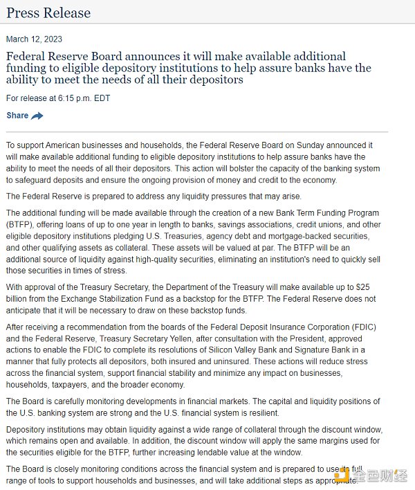 额外资金将通过创建新的银行定期融资计划 (BTFP) 提供,向银行、储蓄协会、信用合作社和其他符合条件的存款机构提供长达一年的贷款,以抵押美国国债、机构债务和抵押支持证券,以及其他合格资产作为抵押品。这些资产将按面值估值。BTFP 将成为针对高质量证券的额外流动性来源,消除机构在压力时快速出售这些证券的需要。