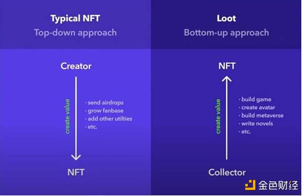 观点2 )游戏内的经济系统,甚至道具的设计和生产都必须交给玩家。 也就是说,必须以纯粹的市场经济模式为中心。 该模式在2021年9月的Loot生态中得到了实践,引起了市场的关注。 与传统的Web3游戏项目不同,创作者设计并销售NFT给藏品,Loot藏品也参与游戏生态建设。 尽管Loot生态在此后的表现并不理想,但当2023年全链条游戏问世时,Loot又成为人们讨论的话题。 (有趣的是,2022年末大火的MAGIC平台生态也是从2021年的路线派生出来的项目)