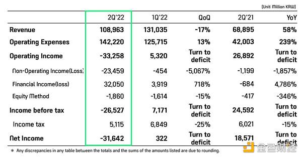 不可否认,根据公司公布的财报,Mir4确实拉动了游戏收入的增长。 Mir4为4Q21的净利润4247亿韩元,约为3亿3700万美元,Wemade的经营状况大幅好转。 不过,Wemade 2021Q4净利润的飙升很大程度上源于Wemix令牌的出售,这一收入目前似乎不具有连续性。 因为在随后的Wemade 1Q22、2Q22财报中发现,公司Web3布局成本的增加并没有持续给公司带来收入的提高。 Wemade 2022年第一季度净利润仅为3.22亿韩元,第二季度财报中wemade合并营业亏损332.58亿韩元,净利润也进入亏损状态316.42亿韩元。