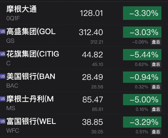 银行股全线走低,摩根大通跌4.71%,高盛跌3.03%,花旗跌5.44%,摩根士丹利跌5%,美国银行跌0.87%,富国银行跌3.21%,瑞士信贷跌14.14%,德意志银行跌6.79%。