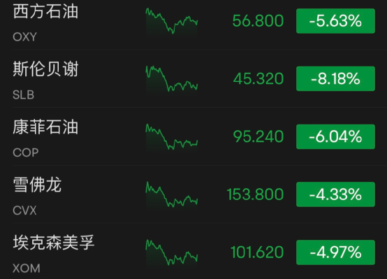 能源股也受拖累全线下跌,埃克森美孚跌4.97%,雪佛龙跌4.33%,康菲石油跌6.04%,斯伦贝谢跌8.18%,西方石油跌5.63%。
