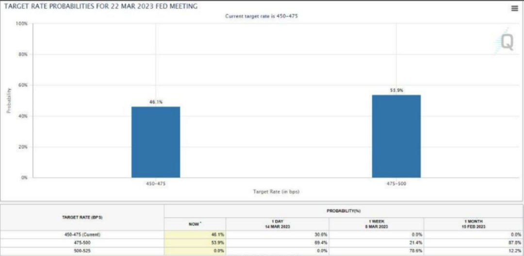 美股尾盘时,市场预计美联储下周不加息的概率降至46%,加息25个概率回升至54%。