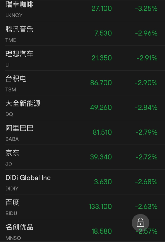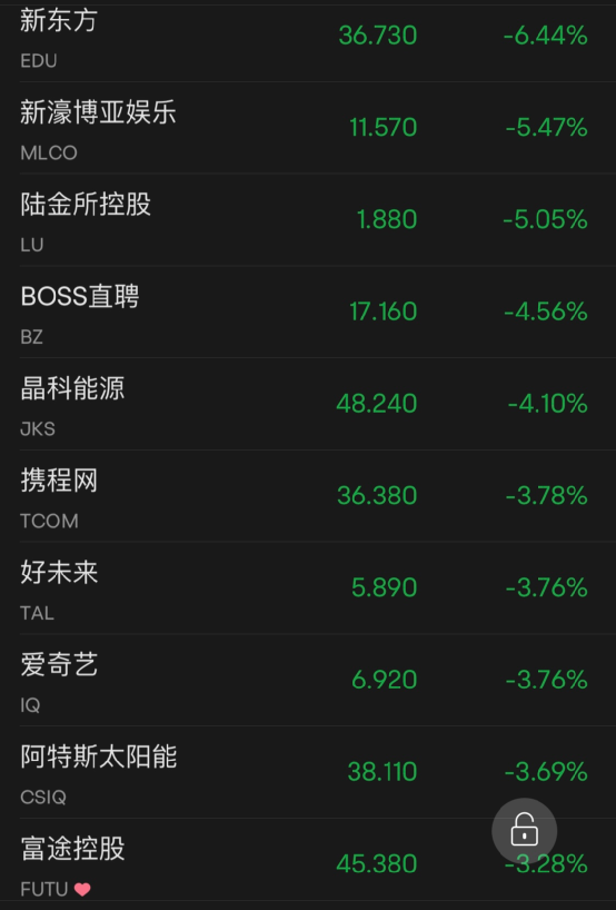 热门中概股普遍下跌,新氧跌20%,信也科技跌14.92%,禾赛科技跌12.36%,达达集团跌7.91%,雾芯科技跌7.14%,新东方跌6.32%,陆金所控股跌4.8%,诺亚财富跌4.56%,亚朵跌4.56%,BOSS直聘跌4.56%,亿航智能跌4.48%。