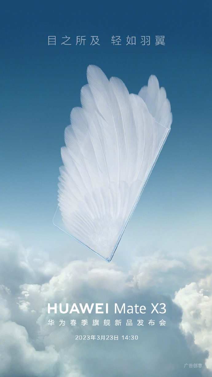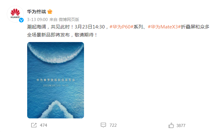 据华为终端官方微博3月13日发布的消息称,华为P60系列、华为Mate X3系列等将在3月23日14:30亮相。