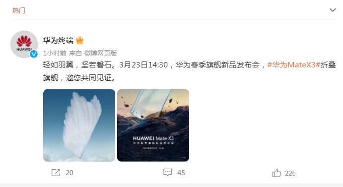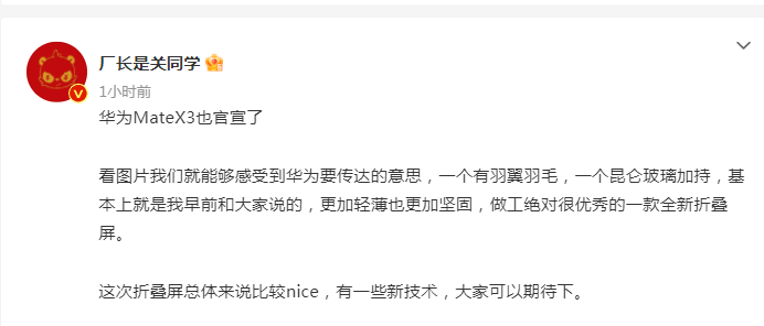 数码博主“厂长是关同学”在微博中表示,看图片我们就能够感受到华为要传达的意思,一个有羽翼羽毛,一个昆仑玻璃加持,基本上就是我早前和大家说的,更加轻薄也更加坚固,做工绝对很优秀的一款全新折叠屏。