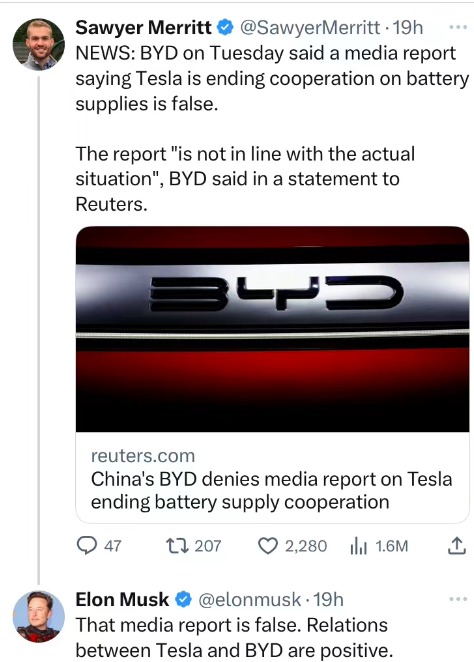 对于上述传言,比亚迪与马斯克均进行了辟谣。特斯拉CEO马斯克于3月14日通过社交平台表示:“媒体报道内容不实,特斯拉和比亚迪之间的关系是积极的。”比亚迪相关工作人员在3月15日接受记者采访时称:“(上述消息)不实,与实际情况不符。”