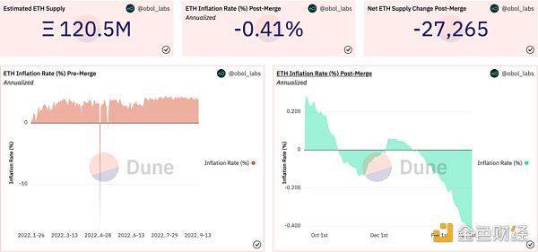 与前几年相比,这带来了通货膨胀的大幅下降。在 2022 年,ETH 的通货膨胀率平均保持在大约 4%。然而,合并后,年化通胀率达到让人惊叹的 4%,因为合并以来,ETH 的流通供给有效减少了大约 2.73 万个 ETH,减少了 0.023%。