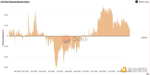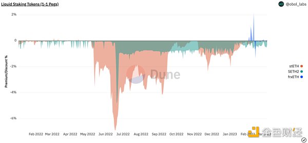 Luna 和 3AC 崩盘引发的混乱给所有 LST 带来了深刻的影响,迫使他们在 2022 年相当一部分时间里以严重的折价进行交易。Lido 的 stETH 基本全年都在以折价交易,特别是五月到八月之间,平均折价 -1.42%。但是在那以后它就恢复过来了,并且现在以接近它的锚定价进行交易。Stakewise 的 sETH2 同样在过去一年努力维持平价交易,但是最近也也恢复过来了,而且交易价格接近平价。相反,frxETH 自十月上线以来就一直保持相当稳定,除了一些例外很少偏离锚定价。