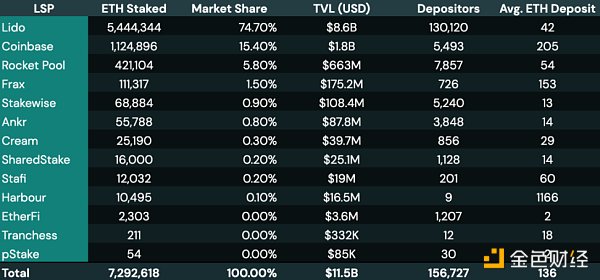 下表展示了以太坊的头部流动性质押提供商,Lido 以 74.7% 的份额遥遥领先,紧随其后的是 Coinbase 的 15.4%,Rocket Pool 以 5.8%排在第三。当我们离提款越来越近时,市场的新星也会冲击市场。比如像 Alluvial 带着他们的机构流动性质押解决方案,还有 Stader Labs 和 Swell 这样的参与者都有可能在上海升级之前部署他们的产品。在流动质押市场的发展潮流中,EtherFi 也不容小觑。