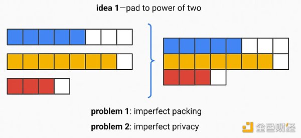 加密数据大小为 n 的明文将创建大小为 n 的密文。即使是这个大小也足以从概率上计算出某些交易。我们可以通过「填充」来缓解这个问题——在加密之前向明文添加 0,将位数扩展为 2 的下一次幂(例如,向 5 位的密文添加三个 0)。