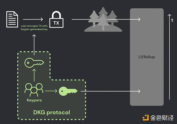 仔细查看 Shutterized Beacon Chain 提案,验证器的一个子集(「keypers」)使用分布式密钥生成器(DKG)生成公钥 / 私钥对。每个人都可以看到公钥,但私钥在委员会中被分成多份保管。重建私钥和解密需要密钥份额达到一定阈值(例如,2/3)。