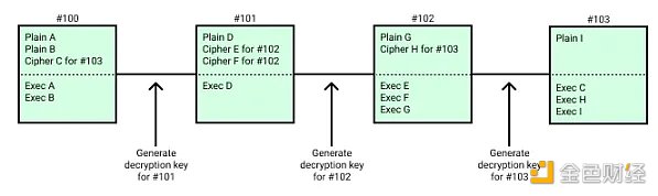 用户可以有选择地加密交易,这些交易在其内容被解密和执行之前被包含在链上。区块生产者使用明文交易(立即执行)和加密交易(计划在未来的区块高度)创建区块。
