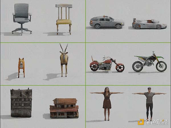 第二条路径是借助AI来“合成”不同视角下同一物品的照片,从而直接生成3D。英伟达在2022年12月的NeurIPS 上展示了 生成式 AI 模型——GET3D(Generate Explicit Textured 3D 的缩写),可根据其所训练的建筑物、汽车、动物等 2D 图像类别,即时合成 3D 模型。和上文中的输出物相比,模型和纹理更精细,更采取了一般3D工具的通用格式,能直接用到构建游戏、机器人、建筑、社交媒体等行业设计的数字空间,比如建筑物、户外空间或整座城市的 3D 表达。GET3D在 英伟达A100 GPU 上训练而成,使用了不同角度拍摄的约 100 万张照片,每秒可生成约 20 个物体。结合团队的另一项技术,AI生成的模型能够区分出物体的几何形状、光照信息和材质信息,使可编辑性大幅加强。