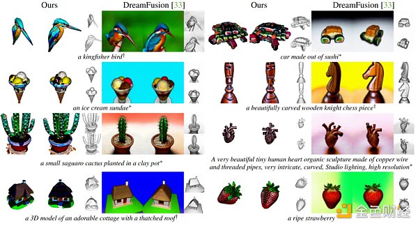 Magic3D(第1、3列)与DreamFusion(第2、4列)对比