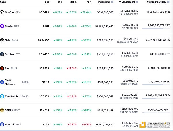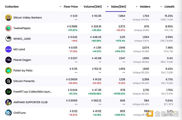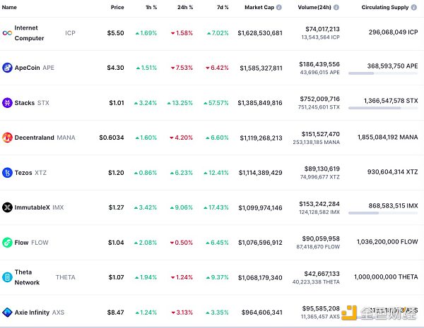 24小时NFT交易量、交易量前十项目 数据来源:Coinmarketcap