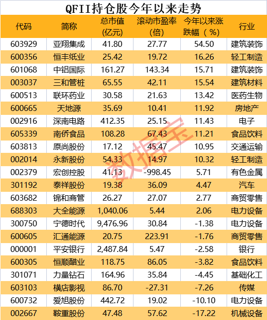 QFII持仓股今年以来股价表现良好。截至3月16日收盘,上述22只个股中,有13只个股今年以来股价实现上涨,占比逾六成。其中,亚翔集成涨幅超50%,恒丰纸业、三和管桩、联环药业等8股年内累计涨幅均超10%。