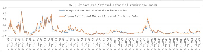 美国的金融压力指数2月份只有-0.35,像金融条件指数,2月份之后或者说最新的数据是-0.38,这些指标都处在历史低位(如下图所示,金融条件指数),整个的金融环境没有受到冲击。