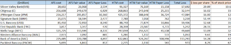 问题在于,除了硅谷银行之外还有像第一共和银行、西太平洋合众银行等等,这些银行也面临类似的问题。我们看数据的话,包括花旗银行、摩根等等,也因为持有美债、MBS出现了账面浮亏的问题(如下表,AFS指可出售资产,如美债;HTM指持有到期资产,如MBS)。