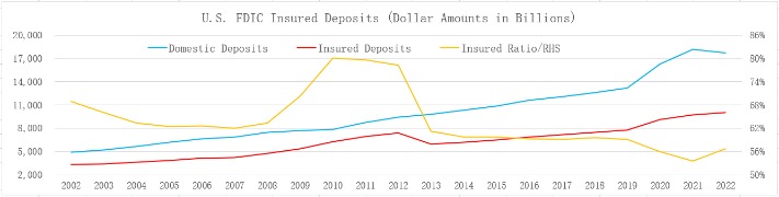最新的数据是什么?去年美国的全部存款17.7万亿美元,其中有10万亿是受到保护的,覆盖率56.8%,比2021年高三个百分点,但是比2010年是降低的(如上图所示)。整体来看,美国超过一半的存款是受到保护的。