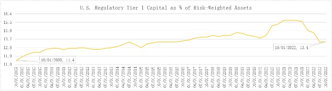 我们看数据,去年美国银行系统整体的一级资本充足率是13.4%,远远高于8%的标准,比2009年高了两个百分点(如上图所示)。也就是说,整个金融系统的资本充足率是非常好的,没有问题。