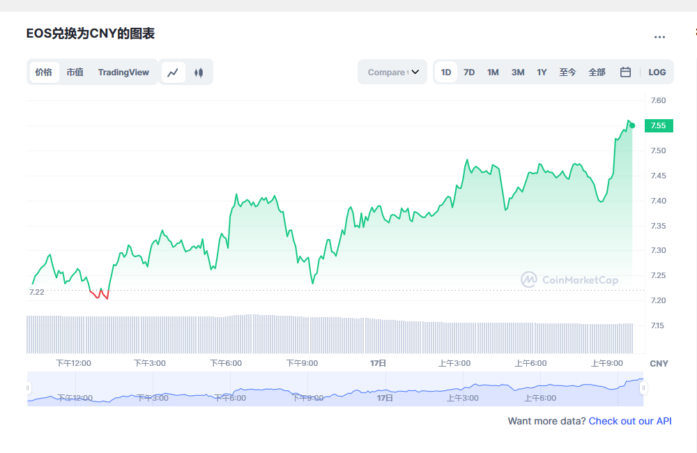 EOS 今日价格 为 ¥7.55 CNY,其 24 小时的交易量为 ¥1,143,645,673 CNY。 我们会实时更新EOS兑换为CNY的价格。 EOS 在过去 24 小时内增长了 4.86。 目前的 CoinMarketCap 排名为第 #44 位,其市值为 ¥8,167,083,288 CNY。 其流通供给量为 1,081,263,745 EOS 个货币 目前无法提供供给量上限信息。