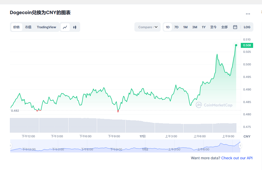 导读Dogecoin 今日价格 为 ¥0.505527 CNY,其 24 小时的交易量为 ¥2,279,662,143 CNY。 我们会实时更新DOGE兑换为CNY的价格。 Dogecoin 在过去 24 小时内增长了 5.15。 目前的 世链财经排名为第 #9