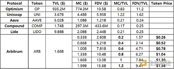 推特用户100y.eth将ARB代币与OP、UNI、LIDO、COMP和AAVE等其他治理代币进行了比较。