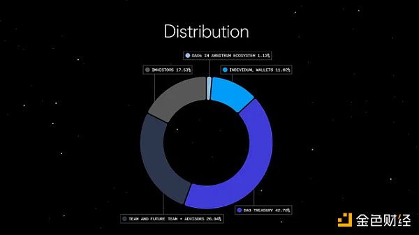据官方数据,ARB代币代币供应总量100亿枚,大部分份额(43%)将进入DAO国库,27%留给团队,17.5%留给项目的投资者,11.62%将被空投到个人用户,剩余的1%将用于Arbitrum生态系统中的DAO。