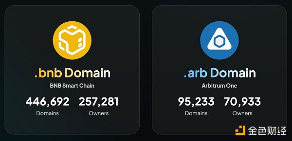 根据 OpenSea 数据显示,.bnb 域名的三字符的域名数量为 813 个,四字符的域名数量为 6766 个,五个及五个以上字符的域名数量为 446621 个。.arb 域名的三字符的域名数量为 1128 个,四字符的域名数量为 3087 个,五个及五个以上字符的域名数量为 92749 个。