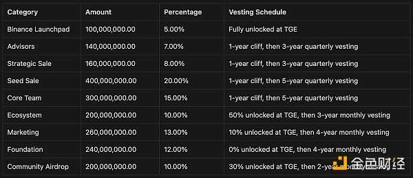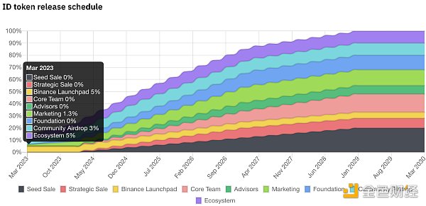 根据官方博客,ID 代币总供应量的 20% 用于种子轮销售,释放周期为 1 年悬崖后以五年周期按季度线性释放;8% 用于战略论销售,释放周期为 1 年悬崖后以三年周期按季度线性释放;15% 归于核心团队,释放周期为 1 年悬崖后以五年周期按季度线性释放;7% 归于顾问,释放周期为 1 年悬崖后以三年周期按季度线性释放;10% 用于生态系统,释放周期为上线解锁 50%,其余部分以三年周期按月线性释放;13% 用于市场营销,释放周期为上线解锁 10%,其余部分以四年周期按月线性释放;12% 归于基金会,释放周期为以四年周期按月线性释放;10% 用于社区空投,释放周期为上线解锁 30%,其余部分以两年周期按月线性释放;5% 用于币安 Launchpad,上线全部解锁。