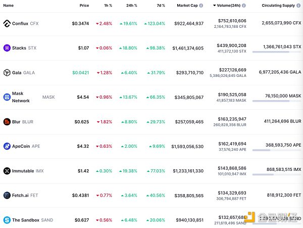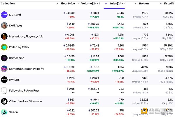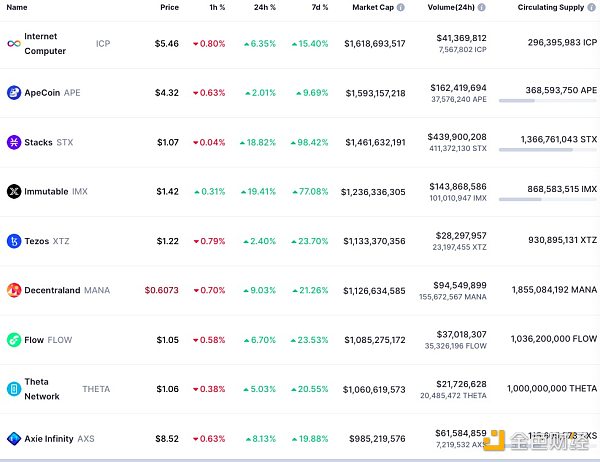 24小时NFT交易量、交易量前十项目 数据来源:Coinmarketcap