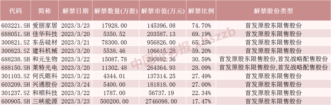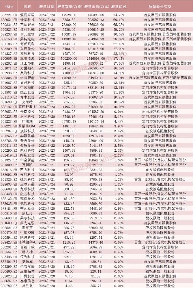 具体来看,数据显示,三峡能源3月23日将解禁50.02亿股,均为首发原股东限售股份。东岳硅材3月21日将解禁7.83亿股,均为首发原股东限售股份。中远海能3月20日将解禁6.02亿股,均为定向增发机构配售股份。