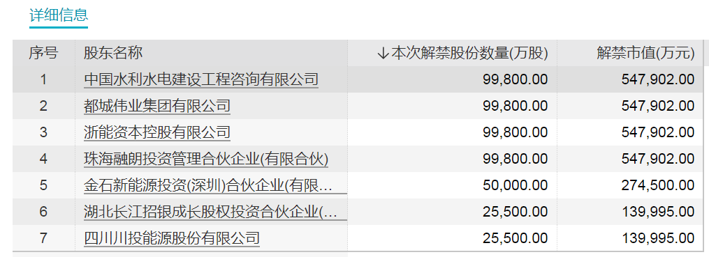具体来看,在下周面临解禁的57只股票中,解禁市值最大的三峡能源解禁股东分别为中国水利水电建设工程咨询有限公司、都城伟业集团有限公司、浙能资本控股有限公司等7个股东。