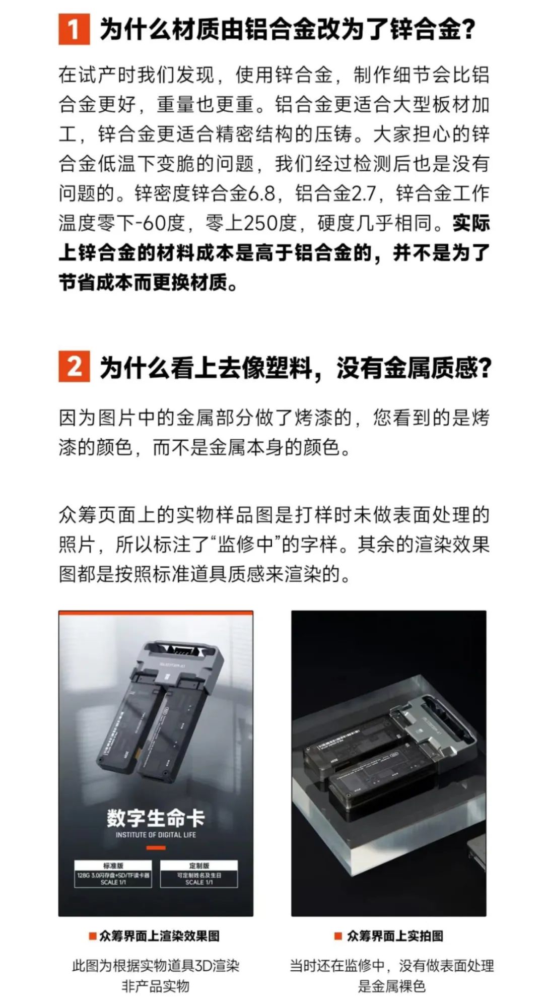 3月16日,赛凡发布关于数字生命卡的最新说明称,在试产时发现使用锌合金制作细节会比铝合金更好,重量也更重。并强调,锌合金的材料成本是高于铝合金的,并不是为了节省成本而更换材质。