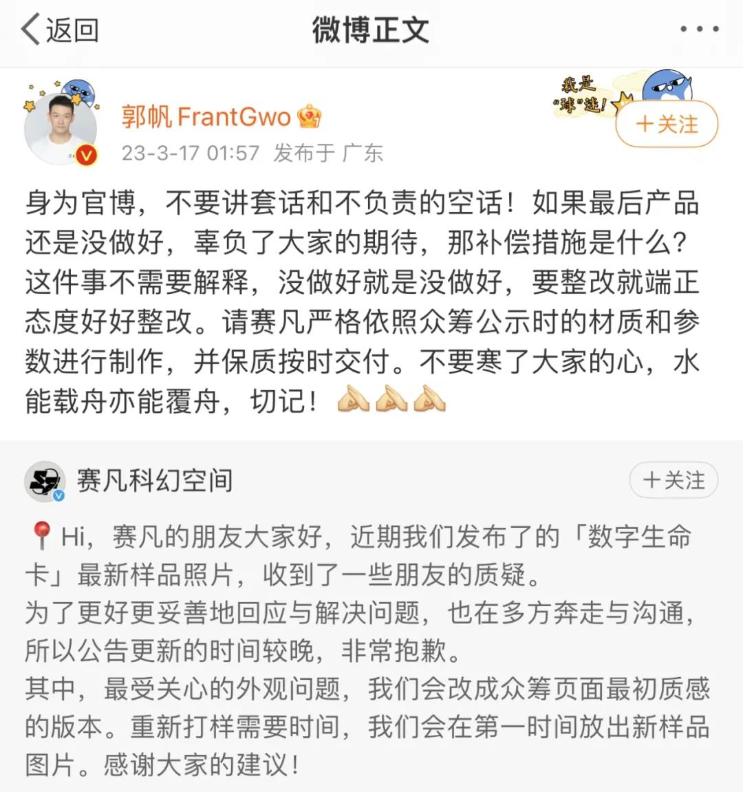 17日深夜两点,《流浪地球》系列导演郭帆转发微博表示:身为官博,不要讲套话和不负责的空话!如果最后产品还是没做好,辜负了大家的期待,那补偿措施是什么?这件事不需要解释,没做好就是没做好,要整改就端正态度好好整改。请赛凡严格依照众筹公示时的材质和参数进行制作,并保质按时交付。不要寒了大家的心,水能载舟亦能覆舟,切记!