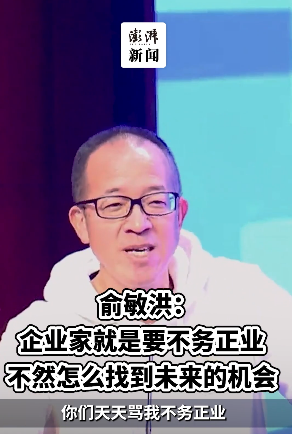 俞敏洪表示企业家就是要“不务正业”,其在“德胜门大讲堂”演讲时称:“就像我开始玩抖音时,天天有人骂我不务正业,现在却因为我的”不务正业“带出了成果。企业家要做的就是”天马行空“:我跟其他企业家喝酒是为了获取他们的思想,我去其他企业考察不是为了吃喝,而是想着未来能否做出另一个业务模式。”