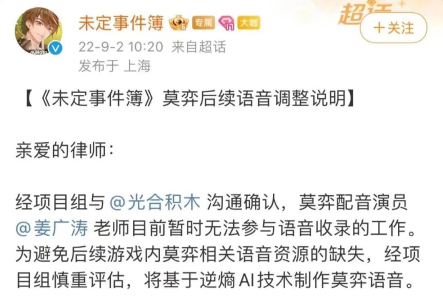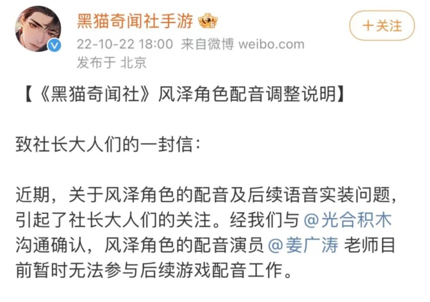 据悉,此前,多个由姜广涛参与配音的游戏、广播剧等项目先后受到影响,或更换配音演员,或暂停录制。