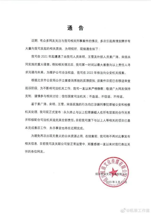 鉴于姜广涛、宋明、王雪、宋扬实施的行为均已涉嫌刑事犯罪被公安和检察机关处理,该公司现正式宣布:永久终止与以上犯罪嫌疑人在所有层面的合作关系并积极配合司法机关追究其全部责任。