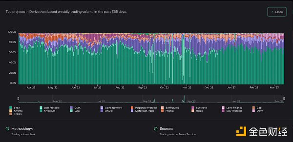 本次更新分配机制的直接原因是市场环境的变化,DYDX代币在近一年的时间里下跌了近70%,而市场份额也面临后起之秀们GMX追击从一年前的95%降至目前的70%。