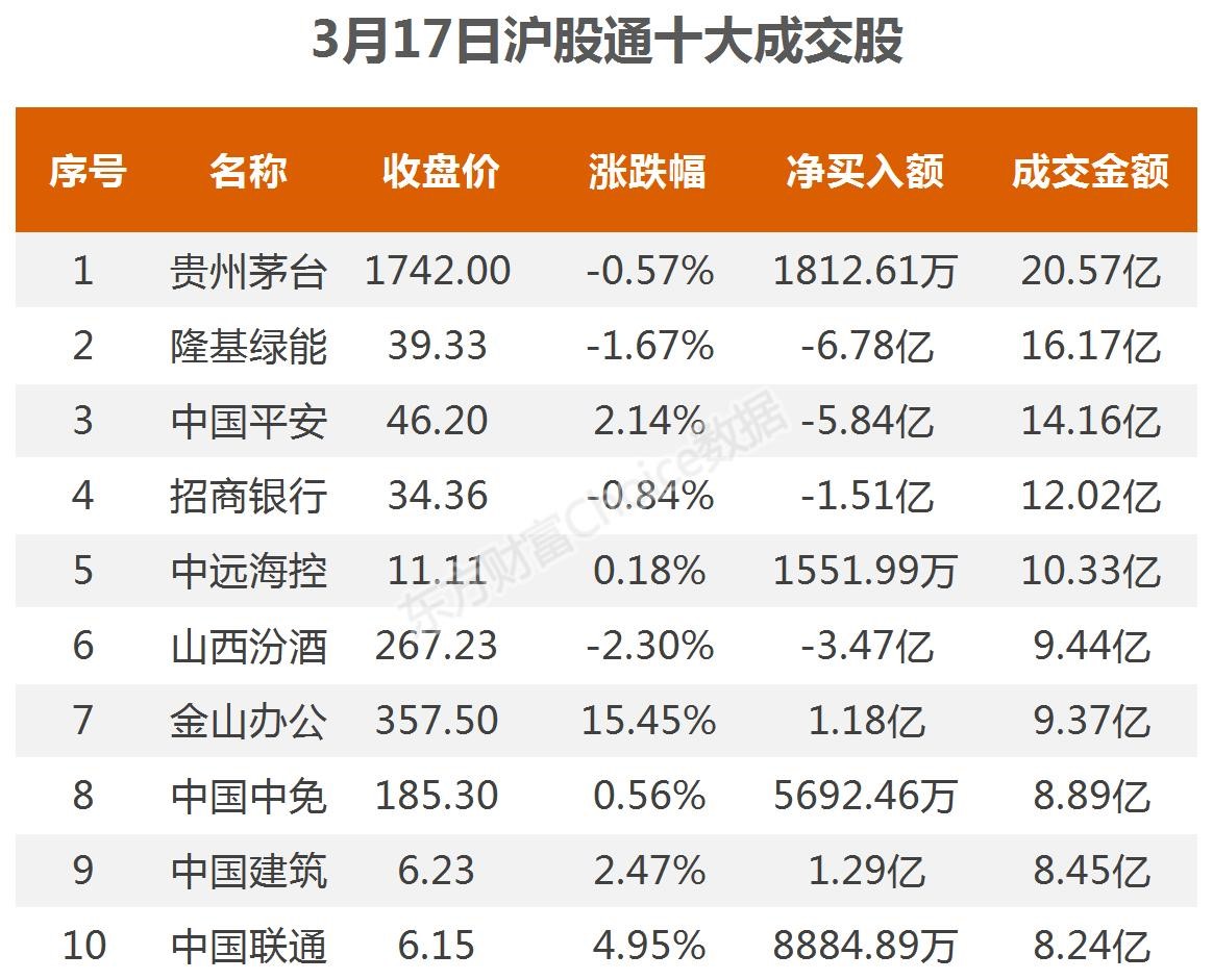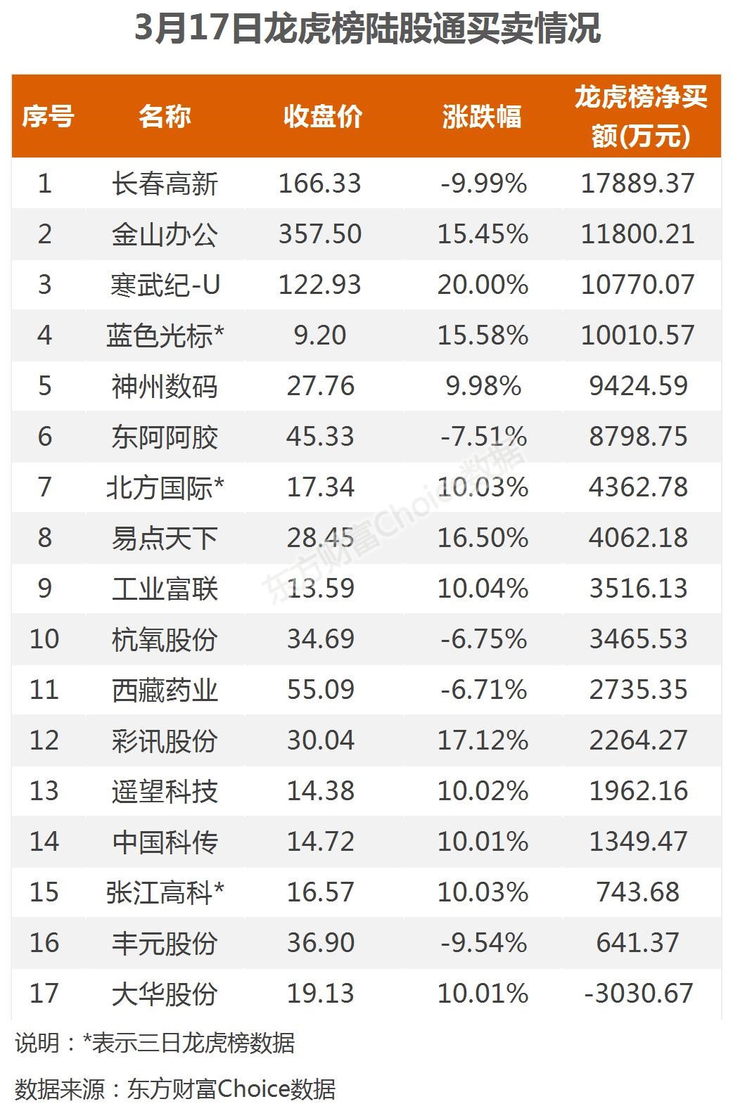 3月17日,陆股通参与龙虎榜中个股共涉及17股,其中16股被陆股通净买入。长春高新被买入最多,净买入1.79亿元,金山办公也被净买入1.18亿元。此外,大华股份被卖出最多,净卖出金额为3030.67万元。