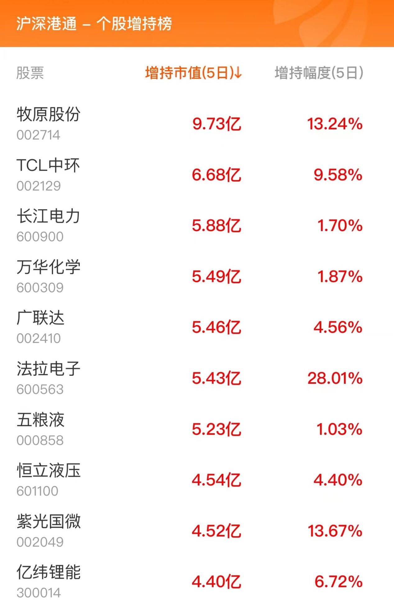 数据显示,近五个交易日,北向资金增持牧原股份9.73亿元,增持TCL中环6.68亿元,增持长江电力5.88亿元。此外,中交地产近五日增持幅度最大,达527.62%。