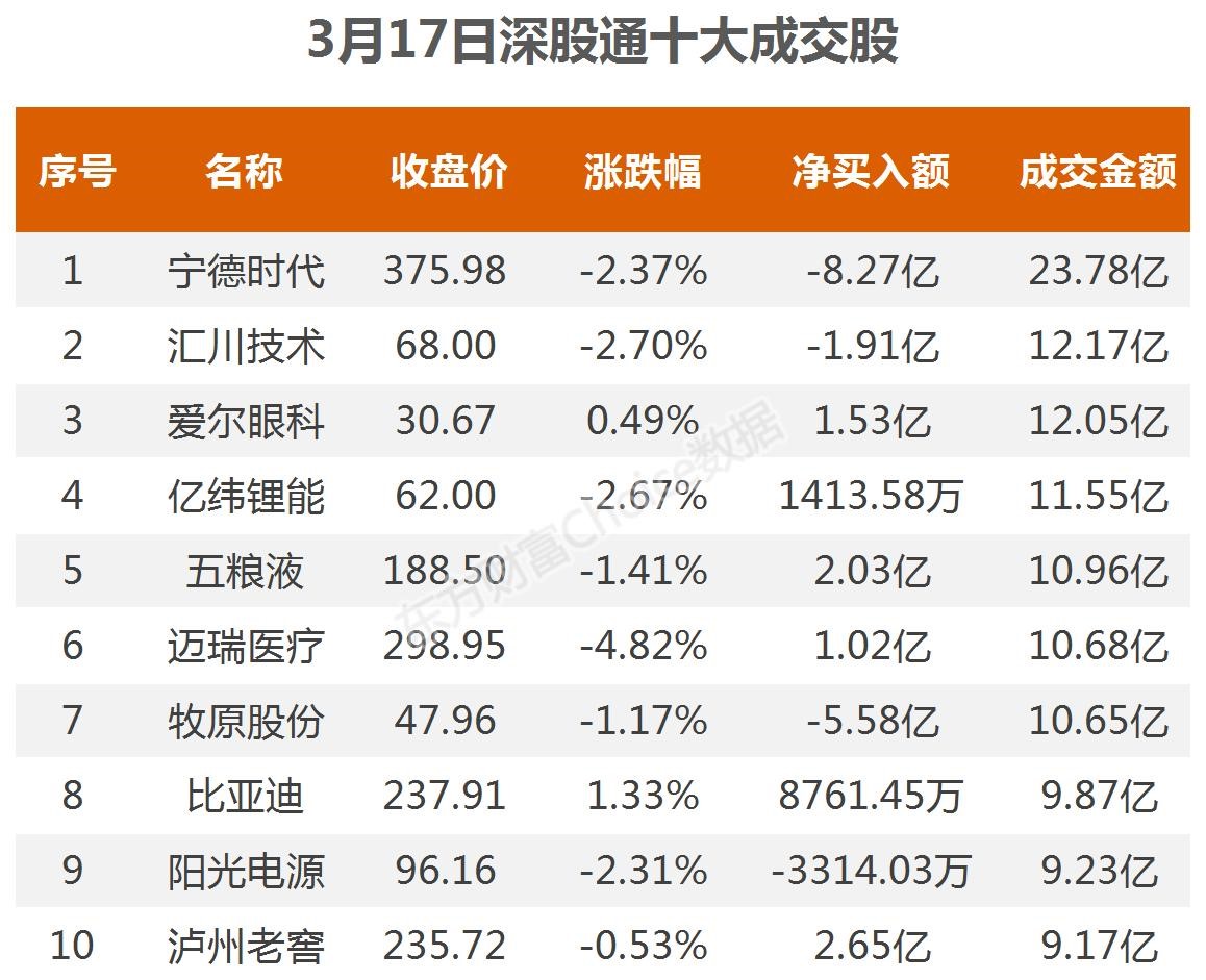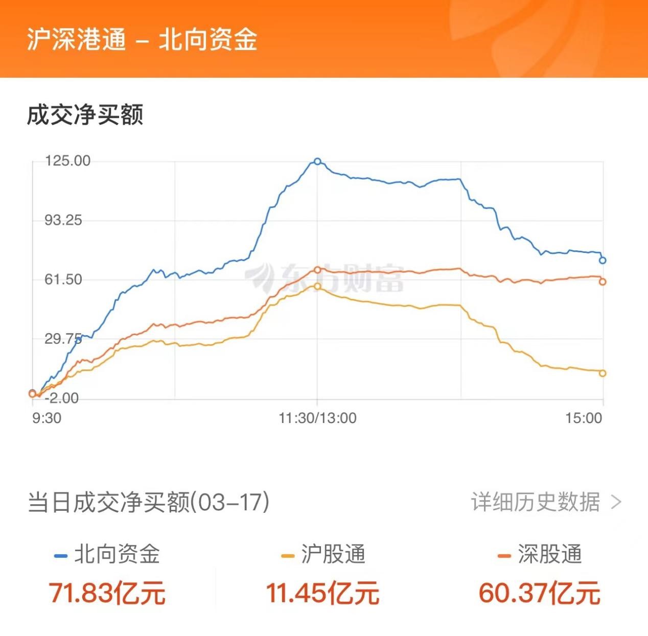 导读3月17日,两市冲高回落,三大指数涨跌不一,但个股涨多跌少。北向资金当日净买入71.83亿元,其中,沪股通当日成交净买额11.45亿元,深股通当日成交净买额60.37亿元。北向资金成交金额13